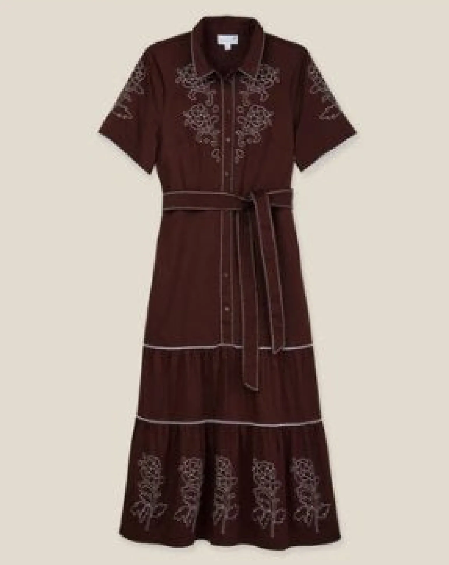 The Cara Dress in Espresso the classic shirt dress with tailored A-line silhouette intricate scalloped trim a modern feel.