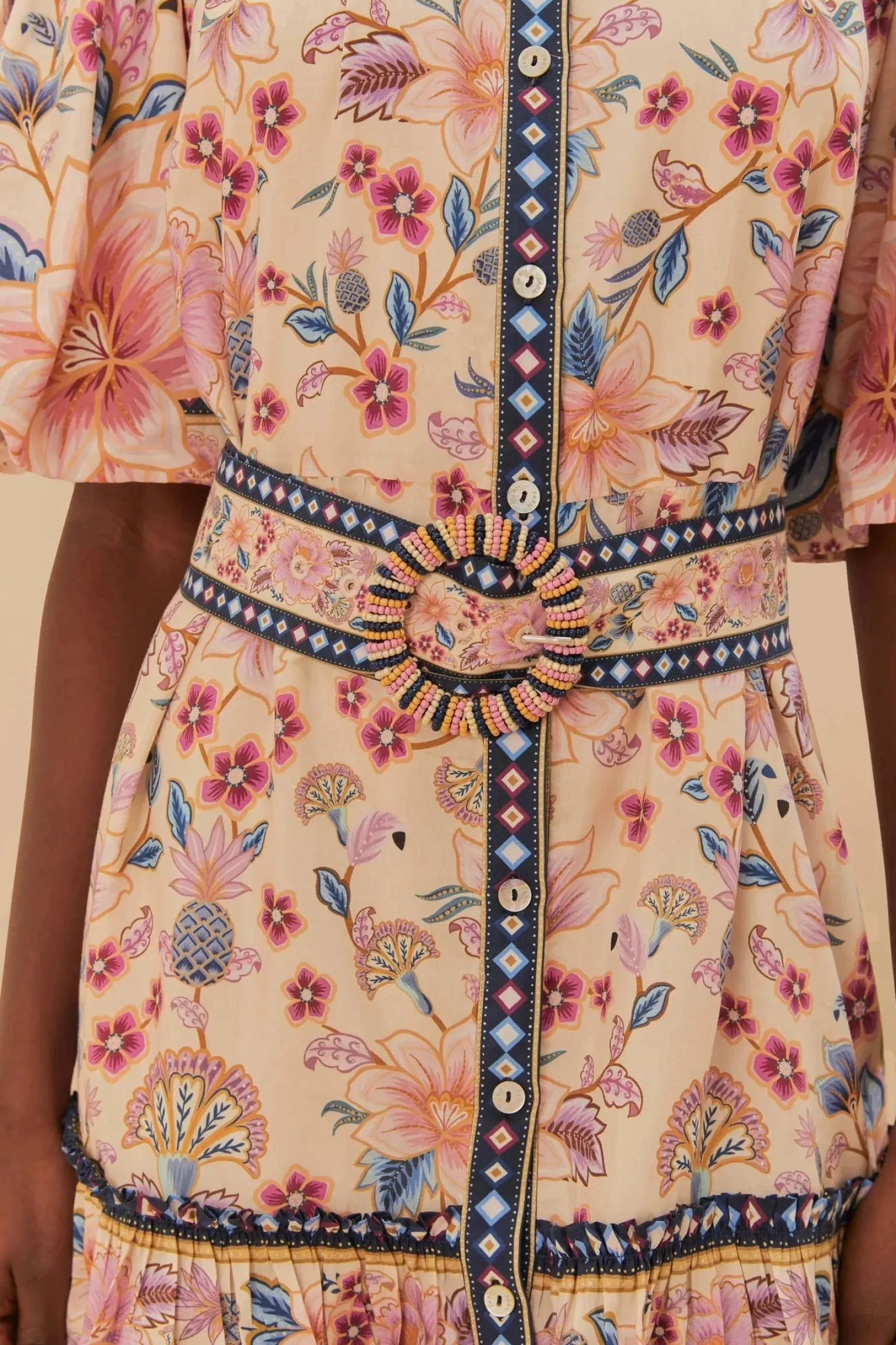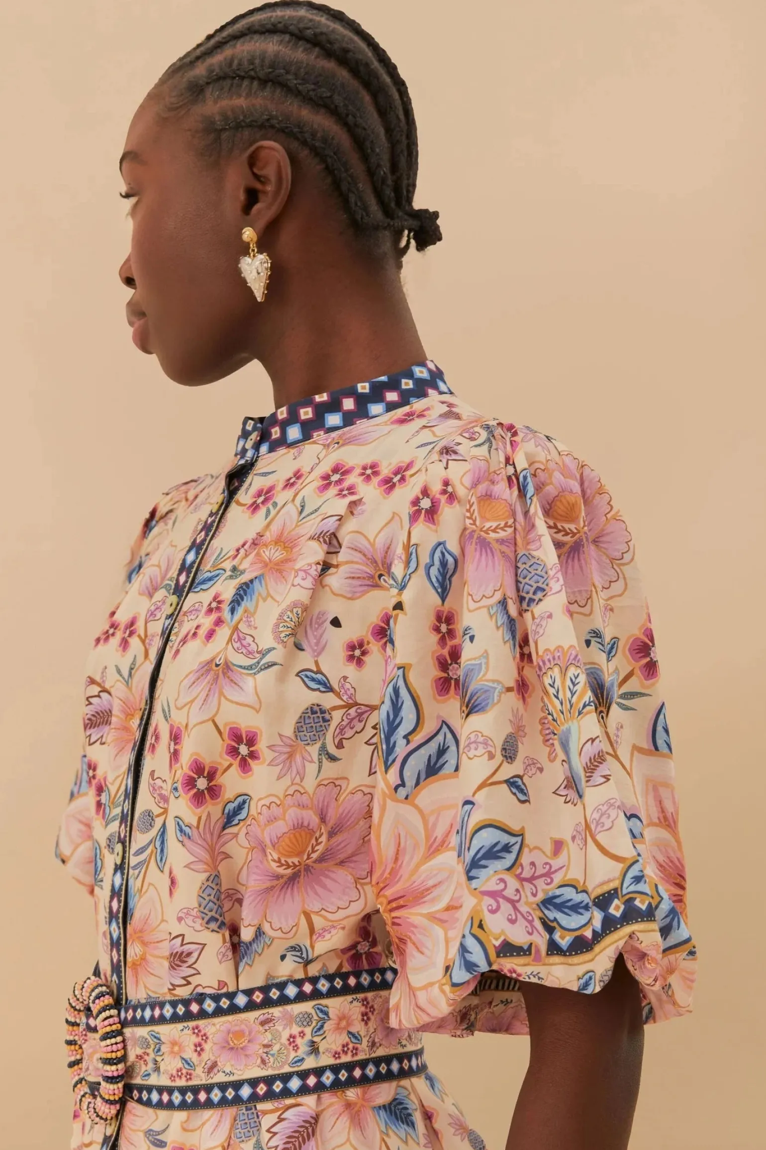 Embrace joyful elegance with the Cream Superbloom Tapestry Puff Sleeve Mini Dress by FARM Rio. The dress features a charming tapestry of vibrant florals in soft pastels. Puff sleeves and a round neckline lend a whimsical touch, while contrasting patterns detail the trim. A delicately adorned belt cinches the waist, adding structure to the playful silhouette. Perfect for celebrating the beauty of nature in style.